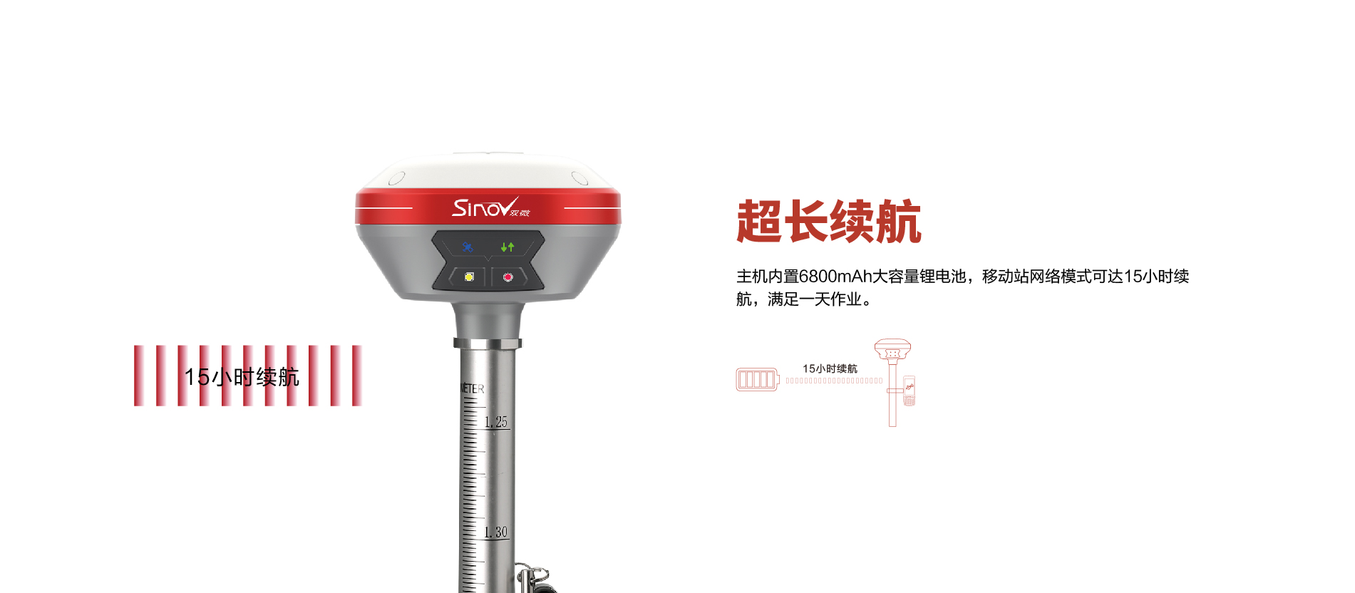 內(nèi)置6800mAh鋰電池,支持移動站15小時(shí)續(xù)航 |